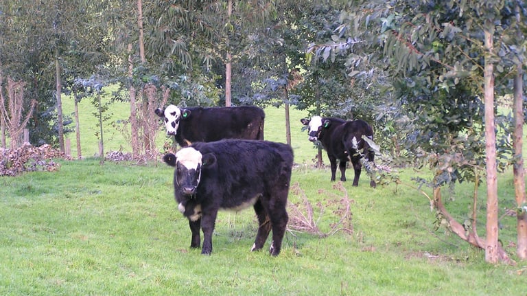 Young cattle loving the shade and shelter whilst chomping on long grass